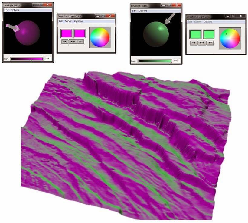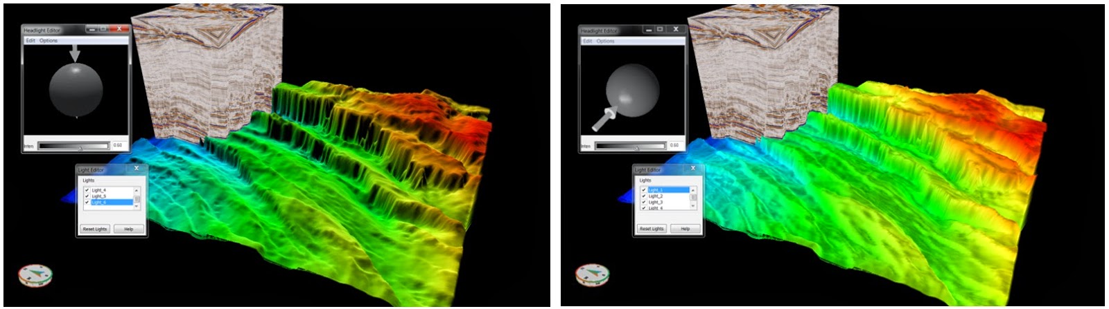When working with horizons, arbitrary and 2D lines, Adjust Lights in the View menu allows you to turn ON/OFF up to six lights and adjust the direction and colour as follows.