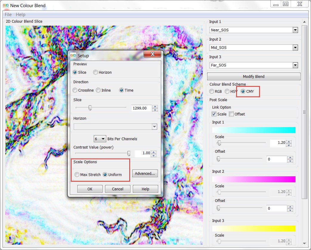 To create a CMY blend using the angle stack SO Semblance volumes, click on Tools>New Colour Blend. The Near, Mid and Far SO Semblance volumes can be put in the respective inputs. After clicking on “set blend”, the result can be previewed on any slice or a horizon. The most crucial step is to select “Uniform Stretch” to make sure the scaling parameters are equal between the volumes blended. The default RGB scheme can then be switched to CMY. This unique ability to preview the colour blend on any slice or horizon prior to actual generation allows the interpreter to save a considerable amount of time and work more efficiently.